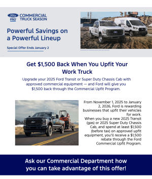 - Work-Ready Inventory – Transit Vans, Super Duty Trucks, Cab & Chassis, and More, in Stock and Ready to Go.